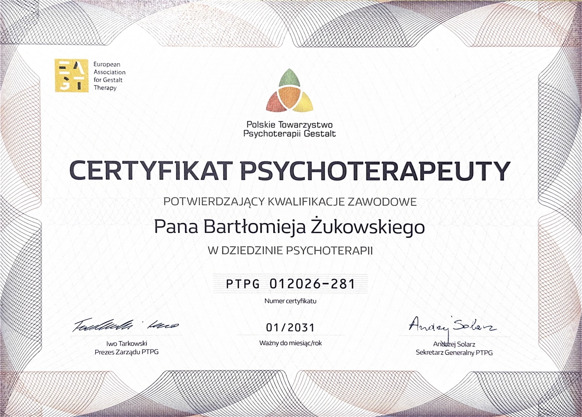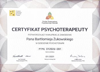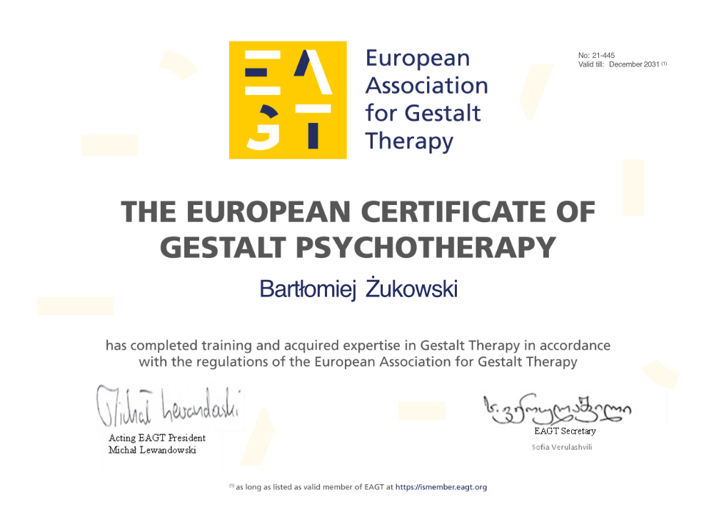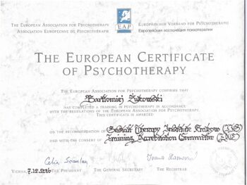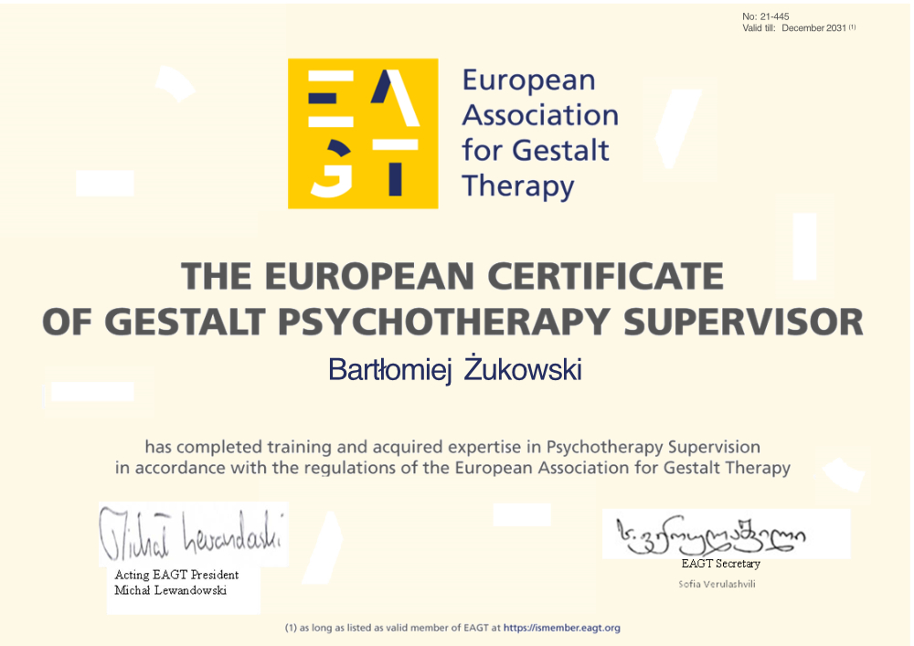Posiadam Certyfikat Psychoterapeuty Polskiego Towarzystwa Psychoterapii Gestalt (nr 012026-281), Europejski Certyfikat Psychoterapii Gestalt (nr 21-445) oraz Europejski Certyfikat Psychoterapii (European Association for Psychotherapy). Jestem także certyfikowanym superwizorem psychoterapii Gestalt (nr 21-445).